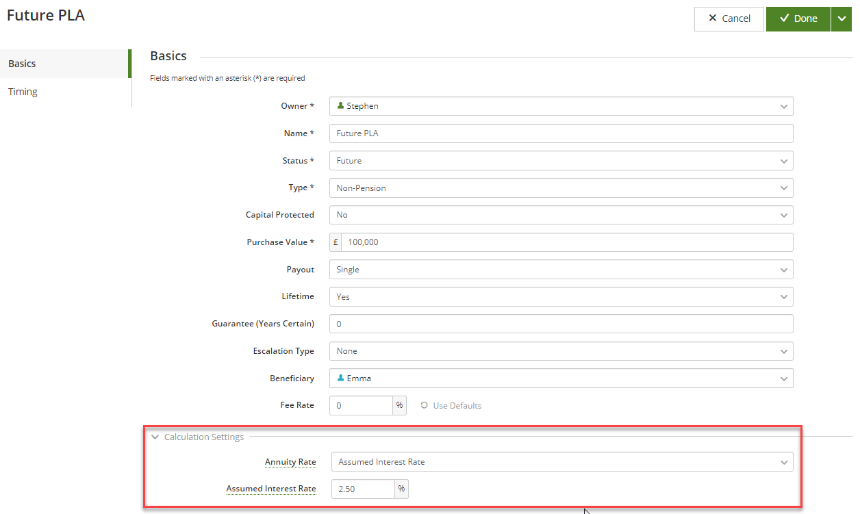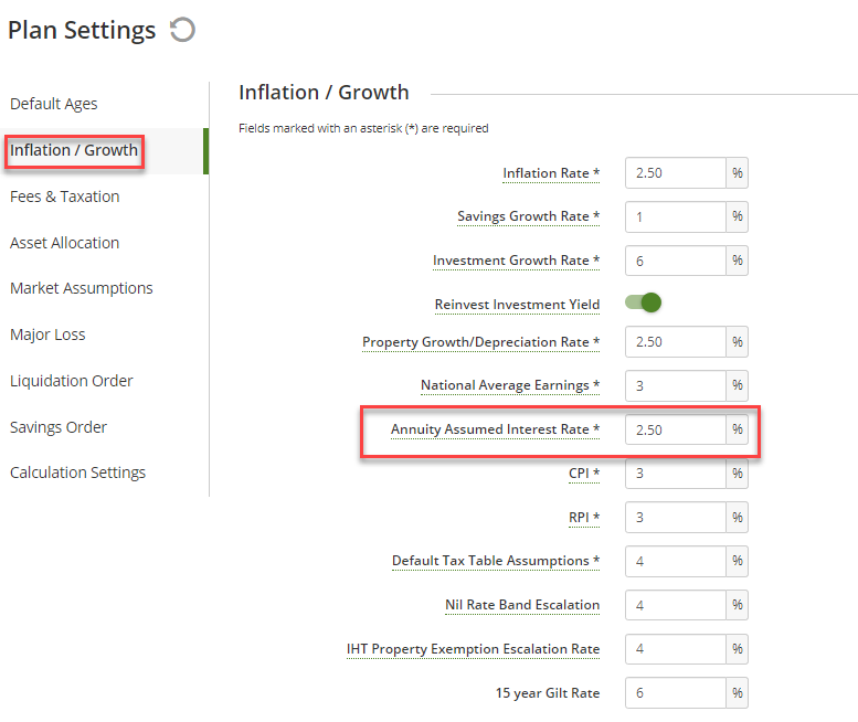 The Assumed Interest Rate is pulled through from Plan Settings > Inflation/Growth > Assumed Annuity Interest Rate but can be over-written if required.