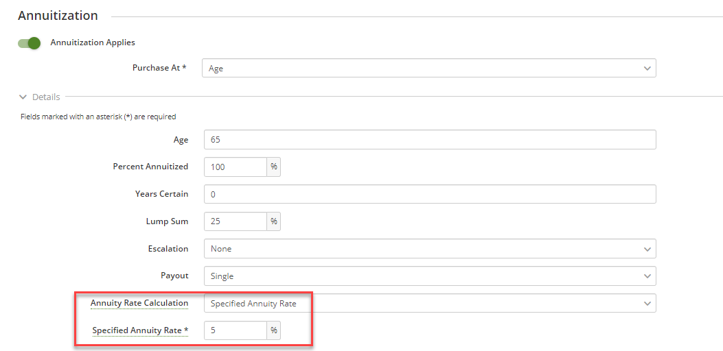 The annuity rate is not used to calculate current annuity payments. If your client is already receiving annuity payments (the pension Status is In Payment or Deferred), payments will be based on the amount entered in the Payment field.