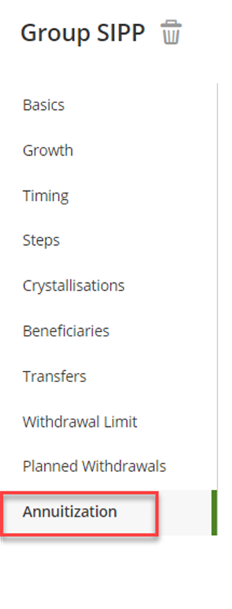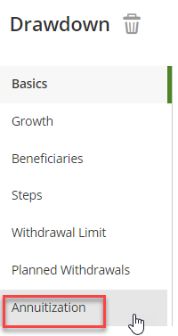 Drawdown Pensions - Settings to schedule the future annuitisation of a drawdown pension are found on the Pensions > Drawdown Pension screen screen under Annuitization: