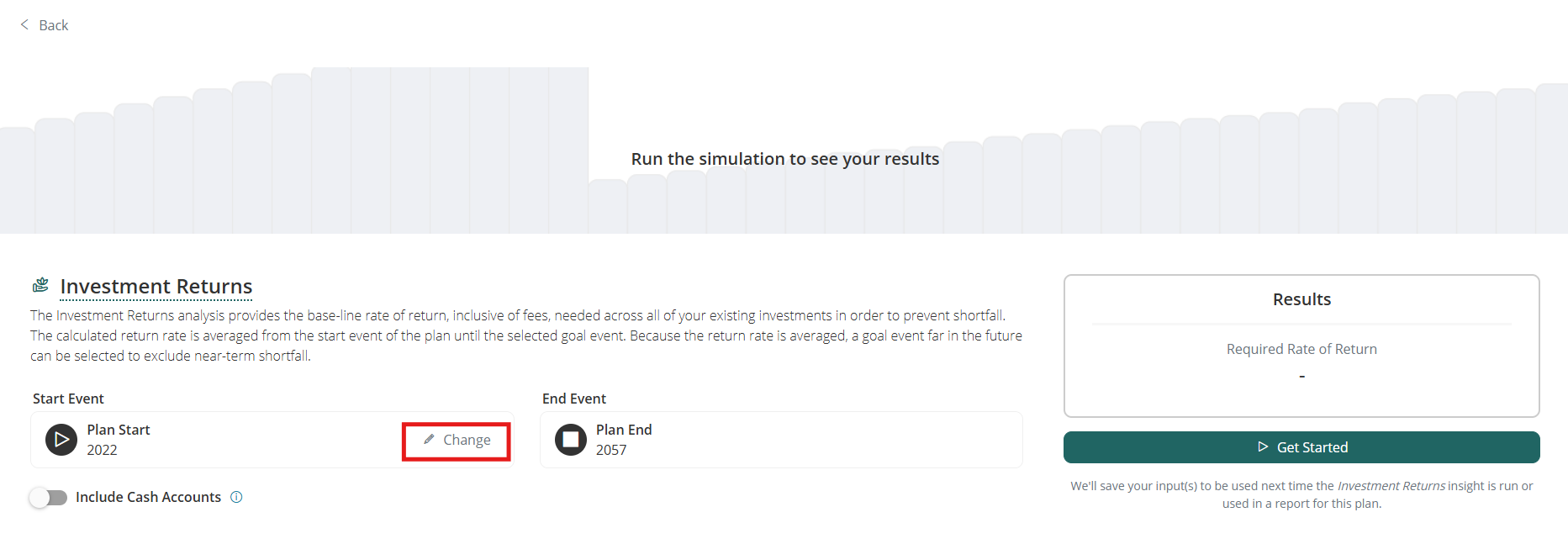To find the average rate of return needed for the entire timeline, simply navigate to Insights > Investment Return Insight > Get Started.
