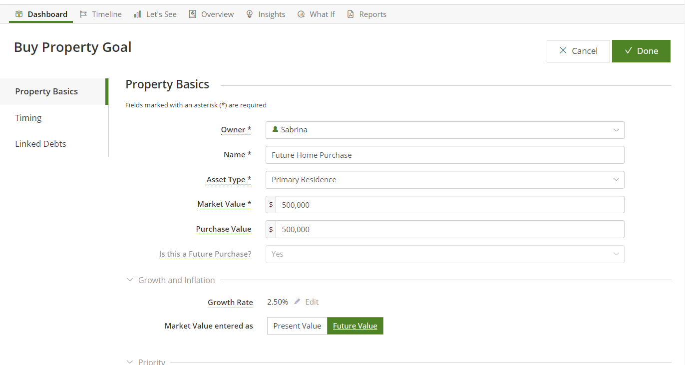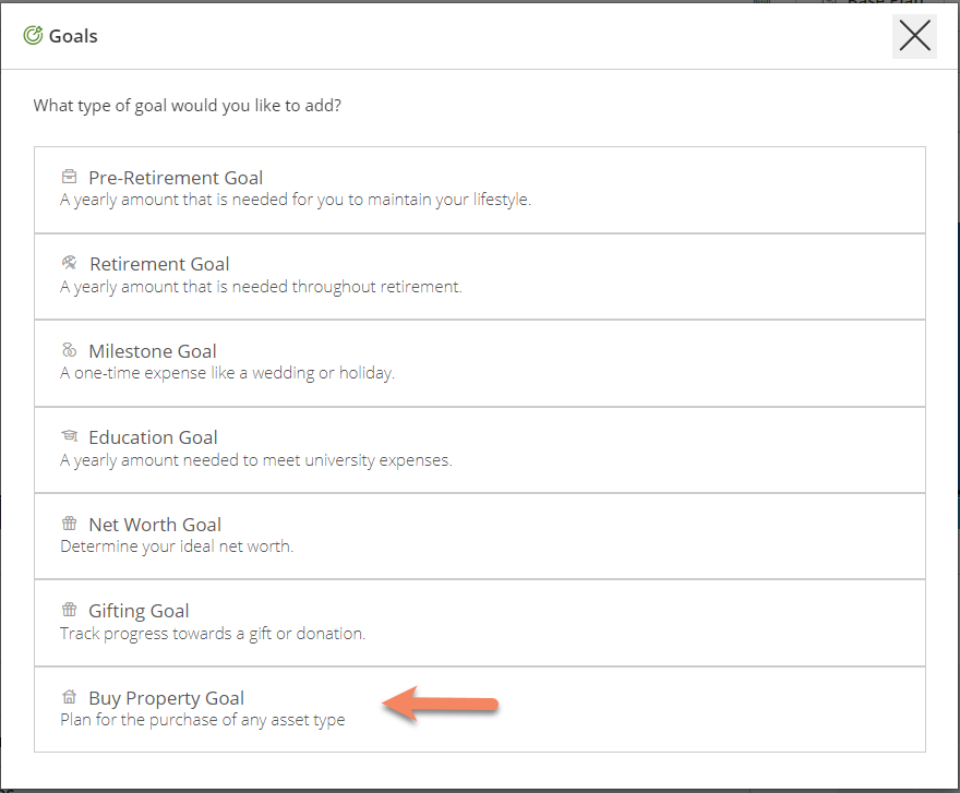The Property Goal in the software will allow you to set a future Goal to purchase a Property. It is set up as a one-off Goal. Unlike other goals, using this goal does not only create an expense in the plan, it also creates an asset for the new property. The software will assume that the Property Asset, when set by the Property Goal, will be purchased at the Event selected for that goal.