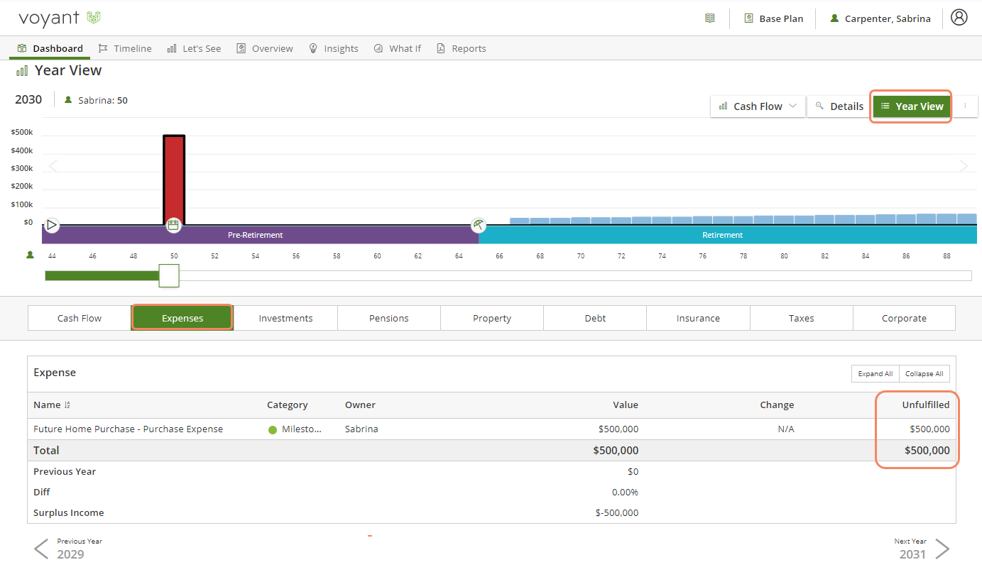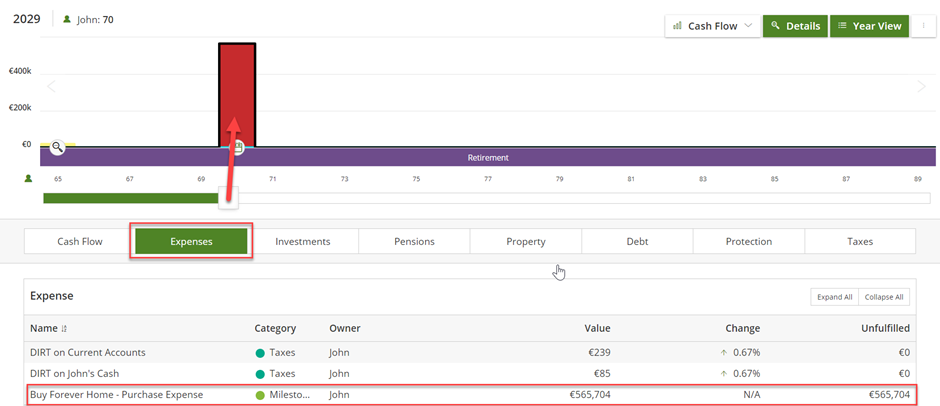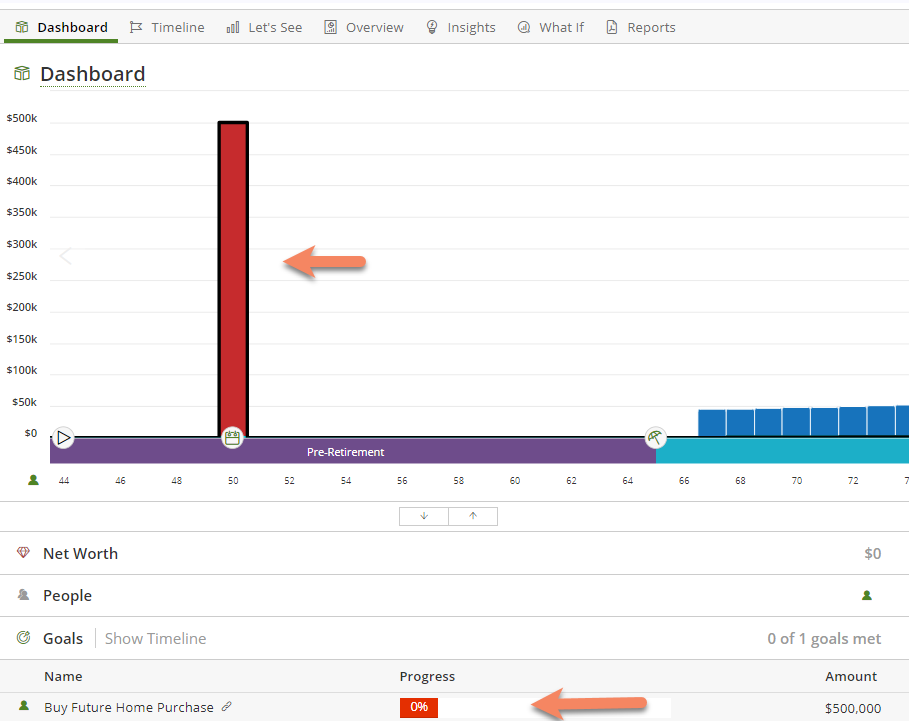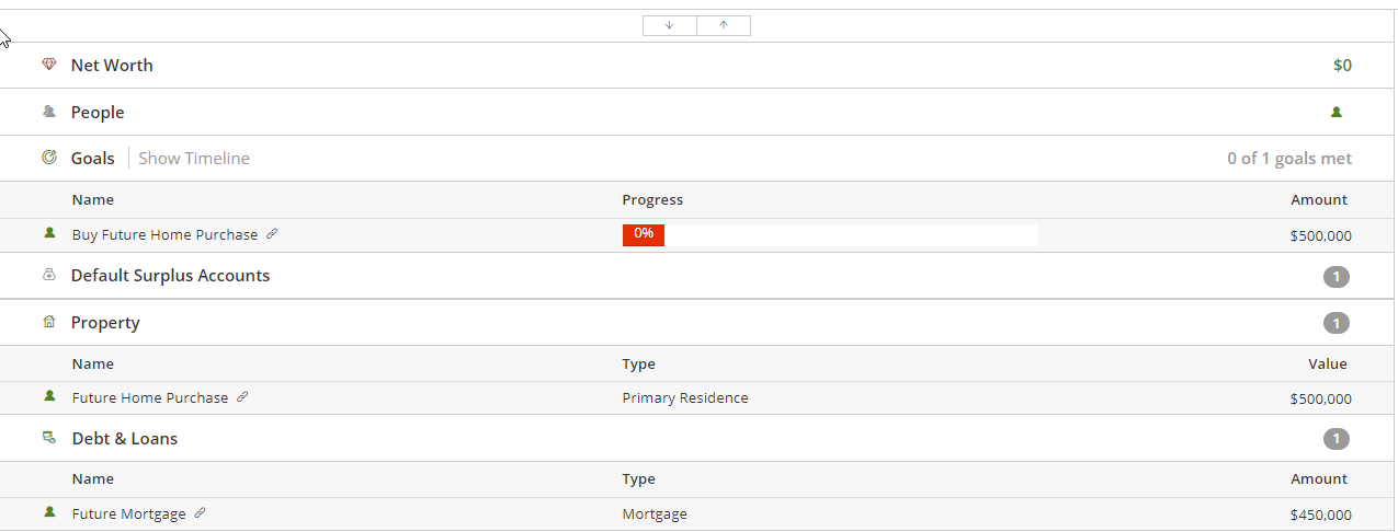If the Property Goal can be fulfilled with the assets in the plan this Goal, like the other Goals, will show as green in the plan with the % of Progress given (as seen above).