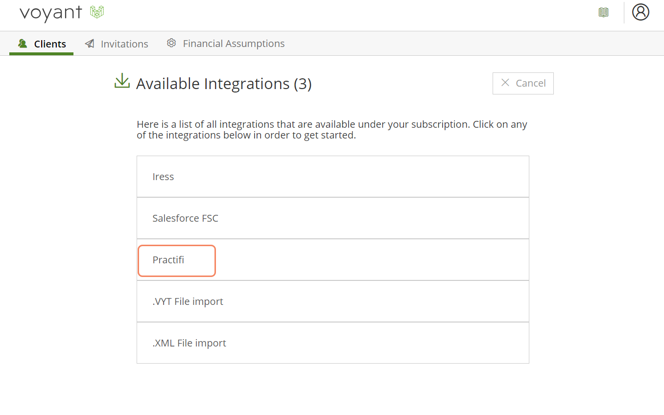 If your firm has an account with one of our integration partners and you don’t see them in your list of import options, subscription owners and administrators can manage this list of available import sources or contact Voyant Support for assistance. Some integrations can also be self-managed and switched on by your subscription's owner/manager.