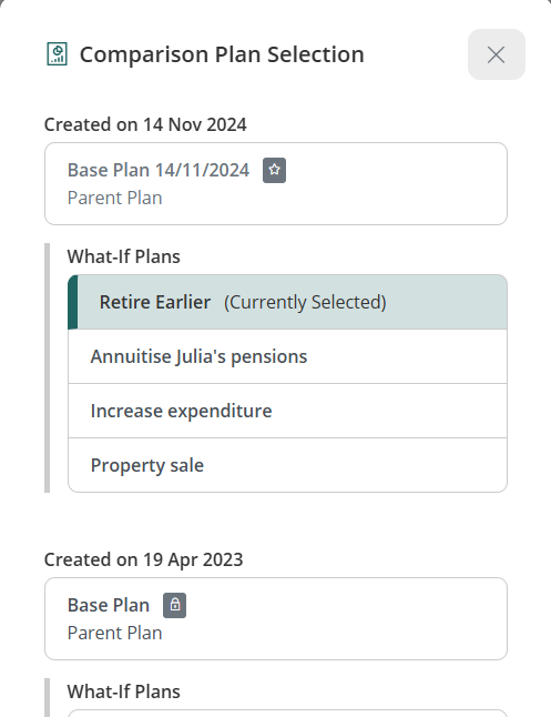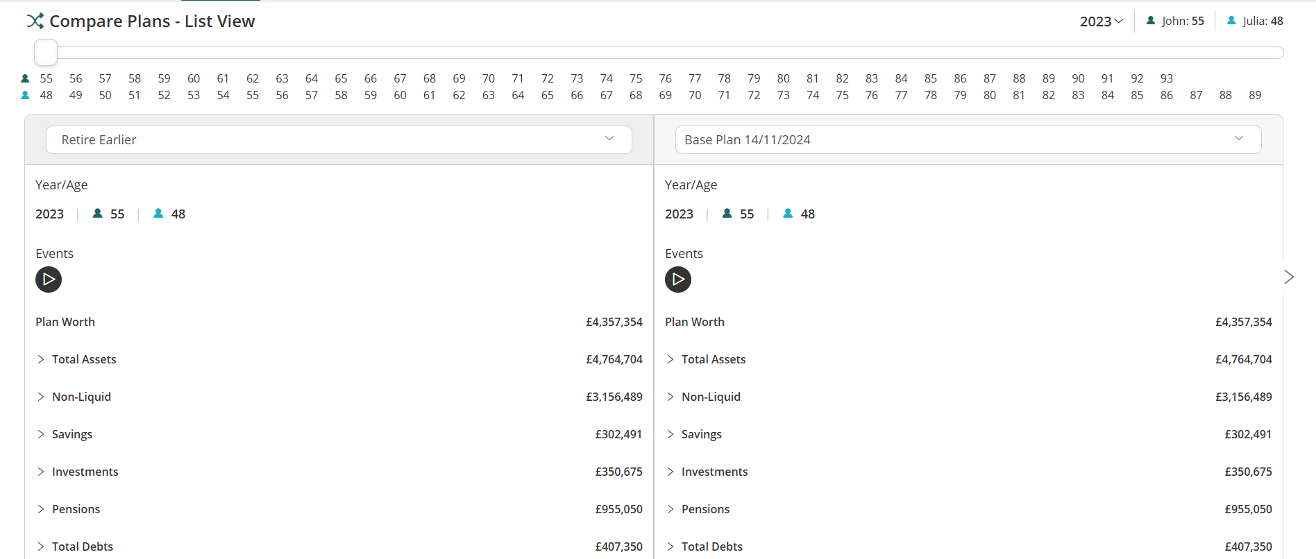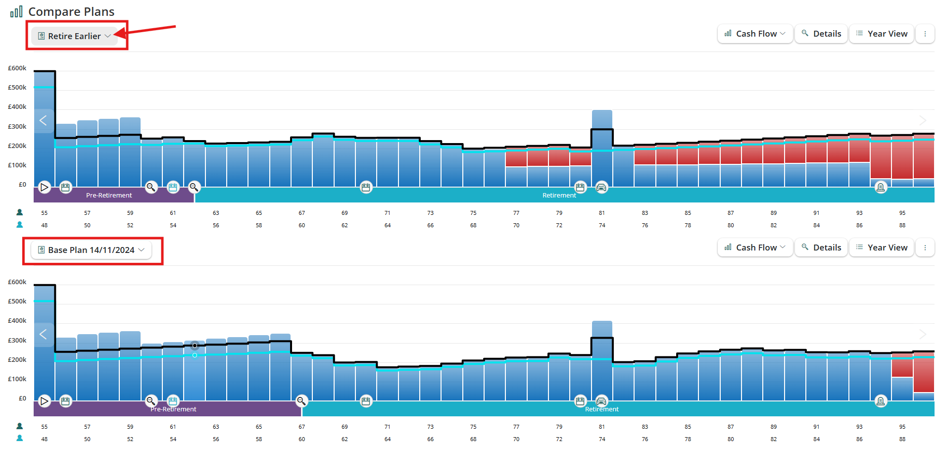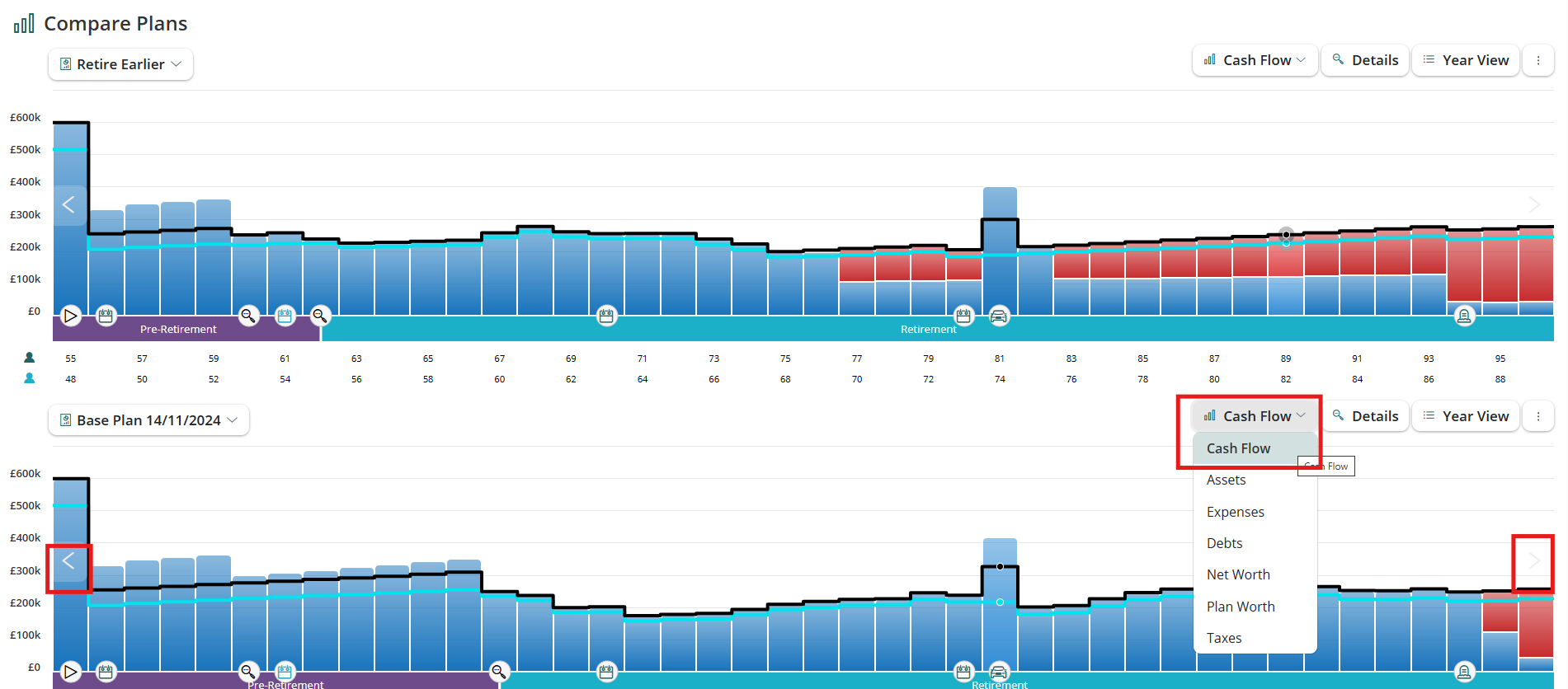 You are also able to change the chart view from Cashflow to Assets etc. for both plans by using the dropdown menu, the arrows or swiping left or right, if you have a tablet or touchscreen computer.