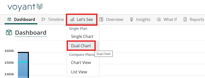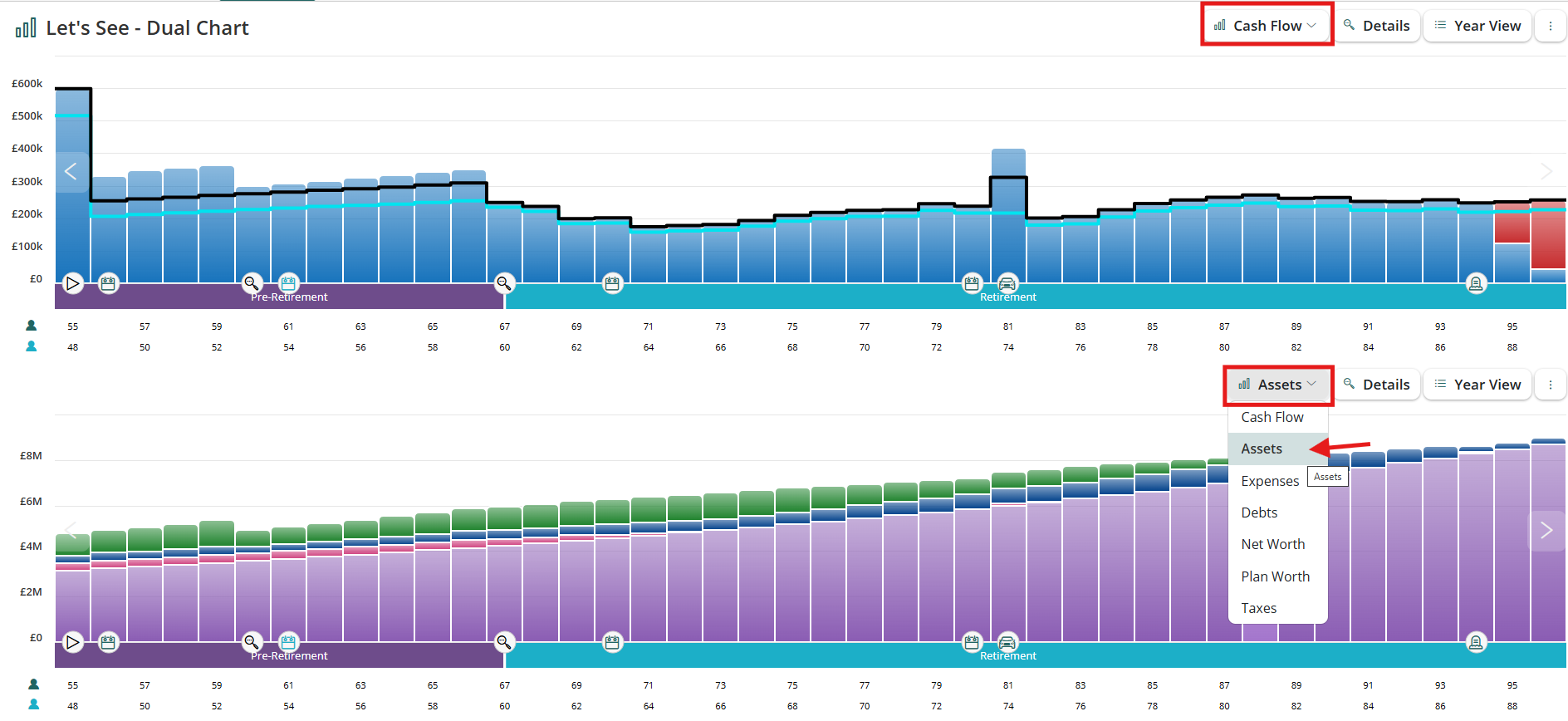 You can show two charts, e.g. both the Cash Flow chart and the Assets chart for one plan, at the same time by clicking Lets See> Dual Chart.