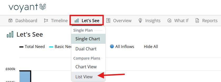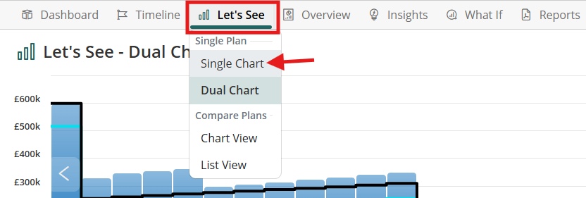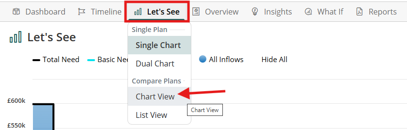 If you have created other scenarios and wish to show the comparison between them, click on Lets See > Compare Plans > Chart View: