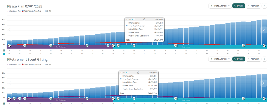 The red line shows the potential inheritance tax and the blue bars show the total wealth transfer. The total wealth transfer figure shows the amount the clients' beneficiaries will receive after inheritance tax, including distributions outside of the estate e.g. pensions (up until 2027). Click on a bar of the chart to view the underlying figures.