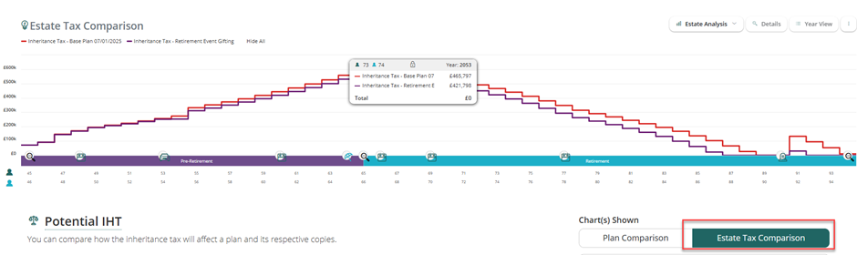 The Potential IHT Insight is used to view the potential inheritance tax and total wealth transfers for each year in the plan. It can be run for one plan or can be used to compare two plans within the same client record.