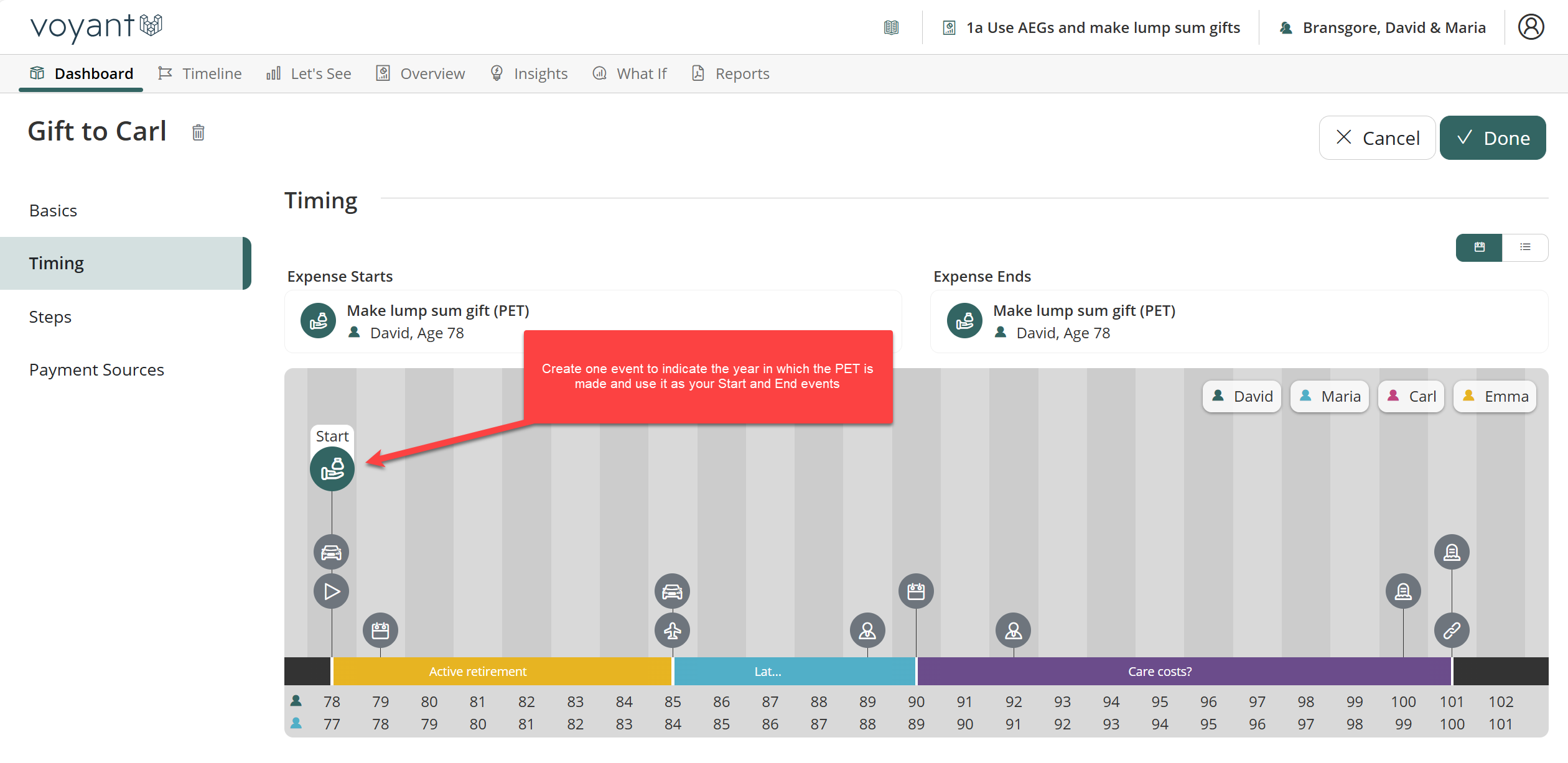 If you have an existing trust in the plan, enter the trust and its existing balance on the Dashboard but use the Carryover Assumptions screen to record any PETs made in the past 7 years or CLTs made in the past 14 years. The software will then include these in the IHT calculations if you model early death, and will apply taper relief, where applicable, to reduce any IHT payable.