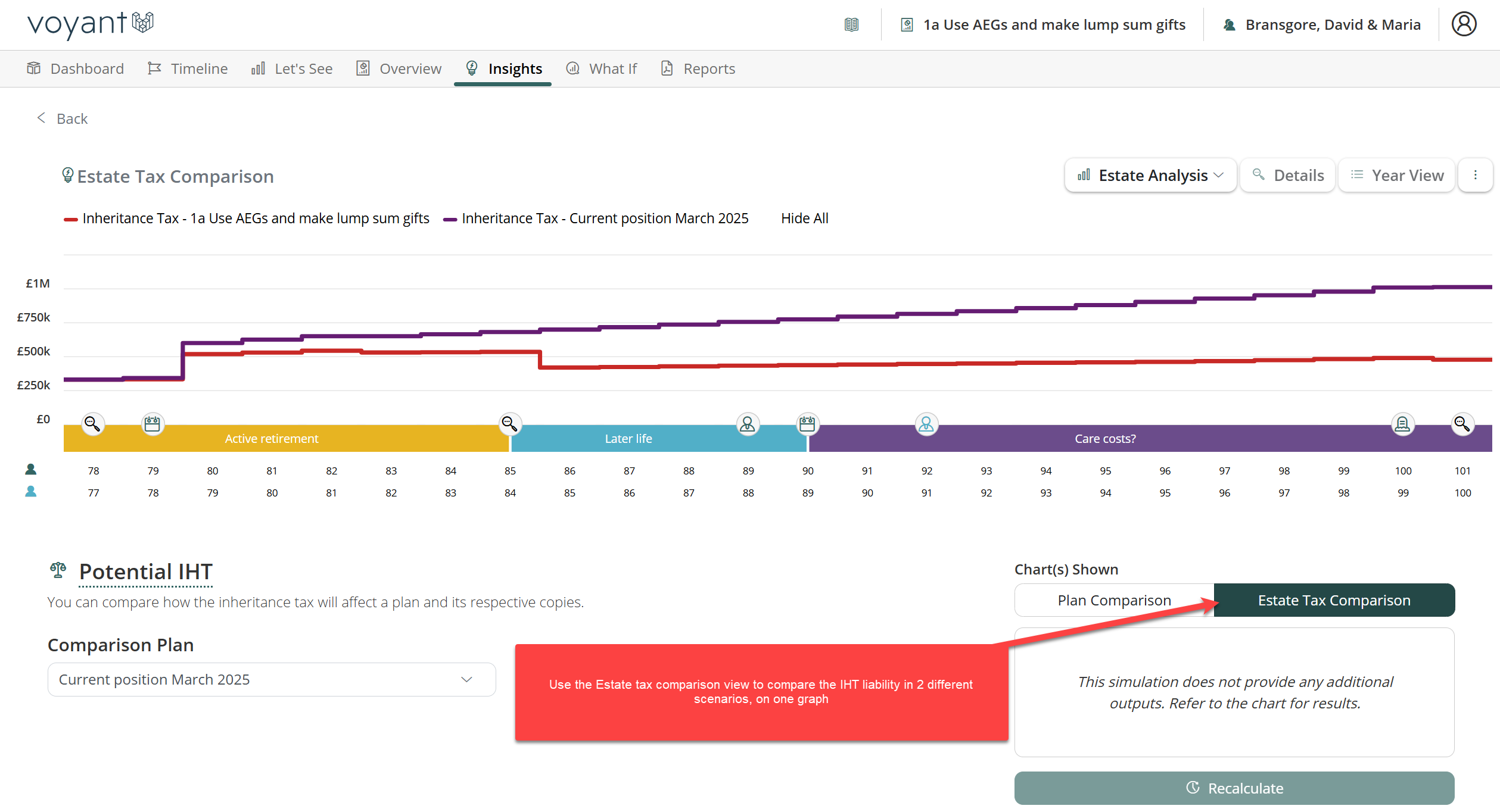 You can run a comparison to compare eg your Base plan with your 'after advice' scenario'. The red line represents the IHT liability in the plan you are working in, and the purple line represents the IHT liability in the comparison plan. You can hover over any year in the graph to see the projected value of the IHT liability.