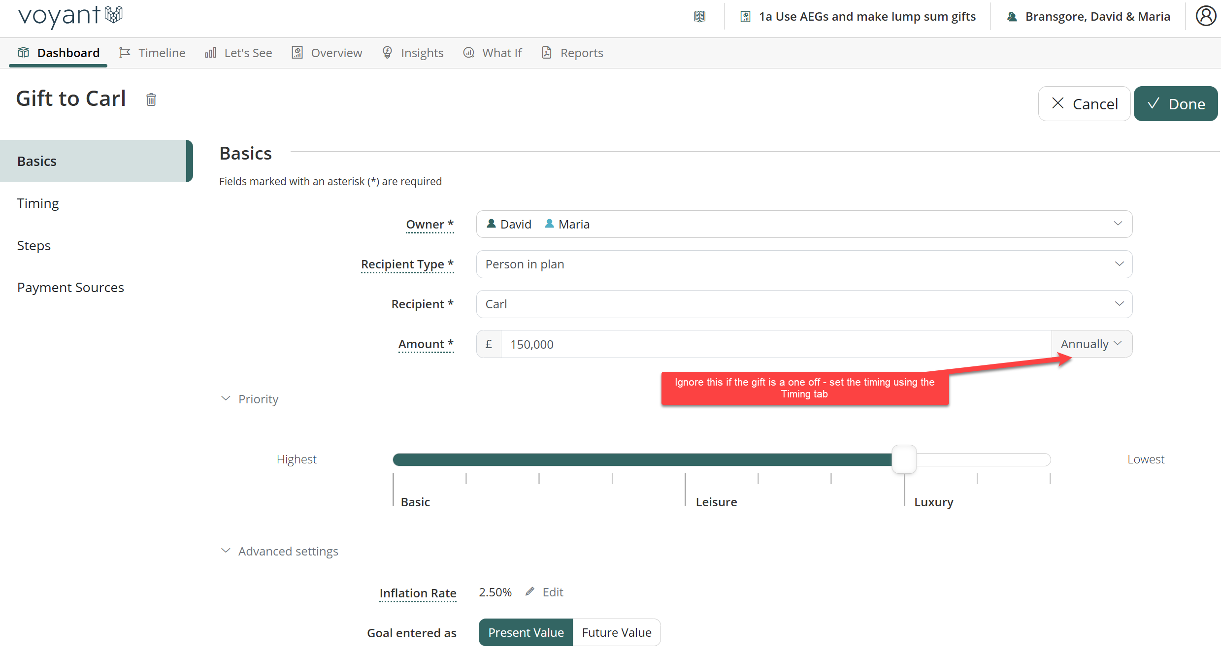 If you wish to model a lump sum gift which is a potentially exempt transfer, use Gifting Goals. Although the Amount box will show a frequency as Annually you can ignore this and use the Timing tab to ensure that the gift is only made once.