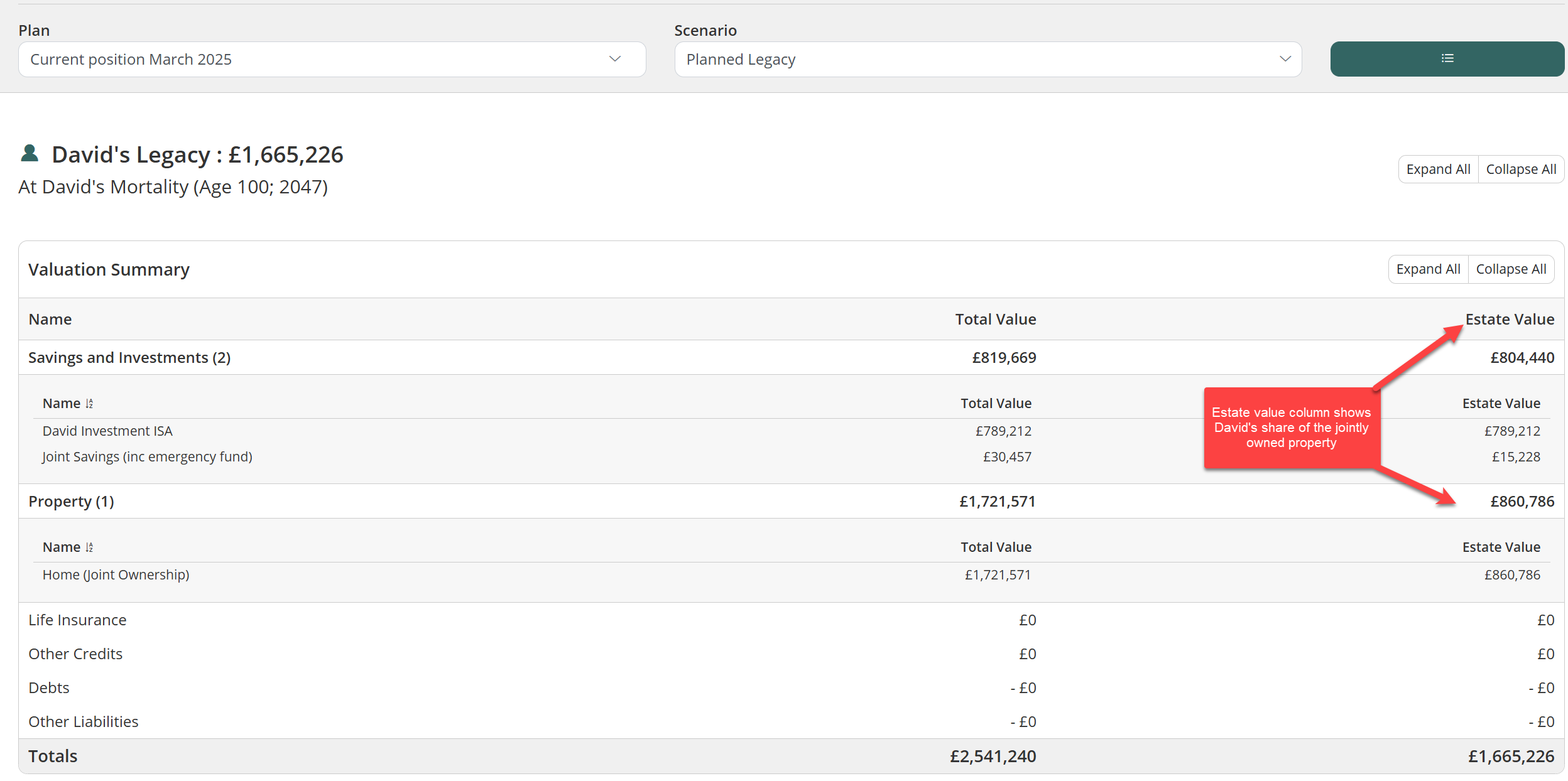 If you were then to scroll down the screen to assess the position on second death, ie Maria's death, once again you would see the valuation summary.
