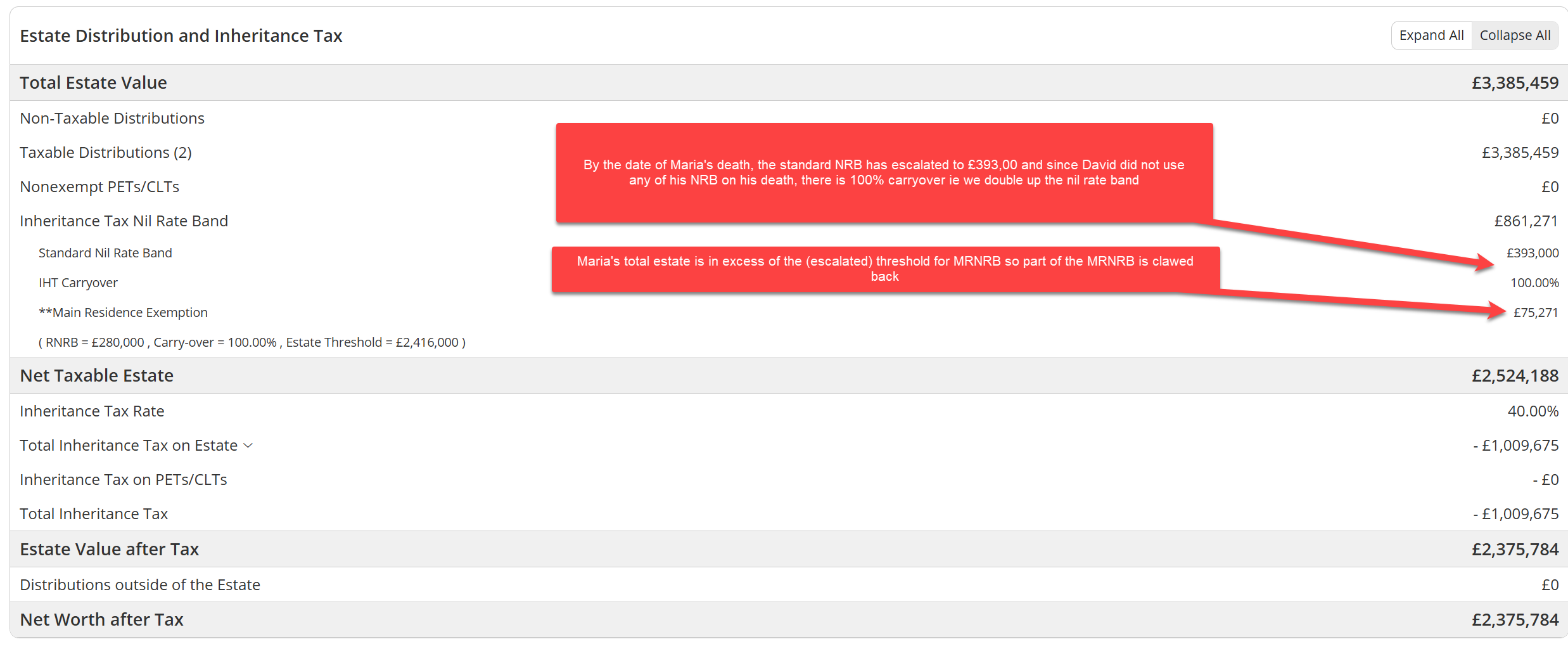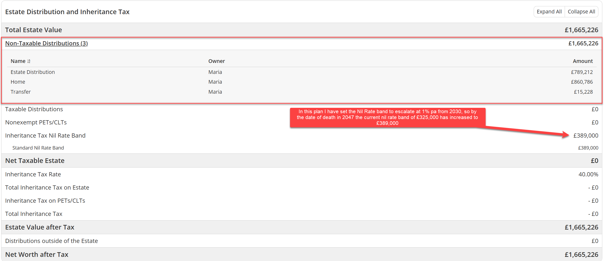 Then the Estate Distribution and Inheritance Tax section shows the taxable distributions ie those which form part of the estate liable to IHT (in this case the value of the home) and other assets. The IHT nil rate band is calculated by projecting forwards the current IHT nil rate band, doubling that up if the first client to die did not use their IHT nil rate band, and adding on any Main residence nil rate band. If there were investments in the plan which qualify for BPR you would also see the nil rate band being extended to include these.