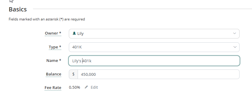 Enter The Basic Details of your client's 401(k) Account (example below)