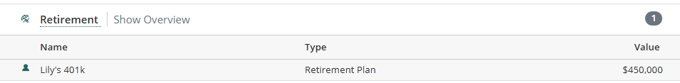 The 401(k) will now appear in the Retirement section, where you can view and access it.