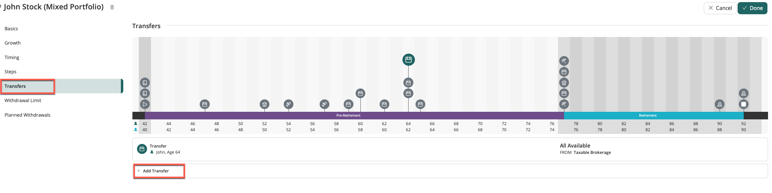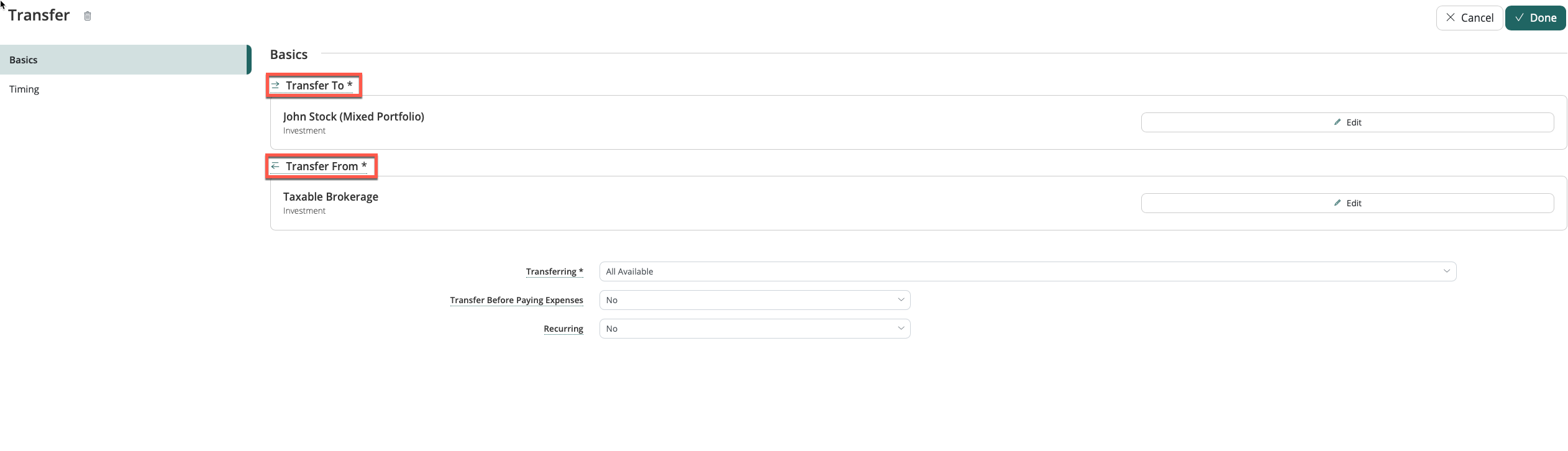 Upon clicking Done, your transfer is saved and will occur during the timeline as configured. Review the Timeline and Savings dashboards to confirm this is reflected correctly.
