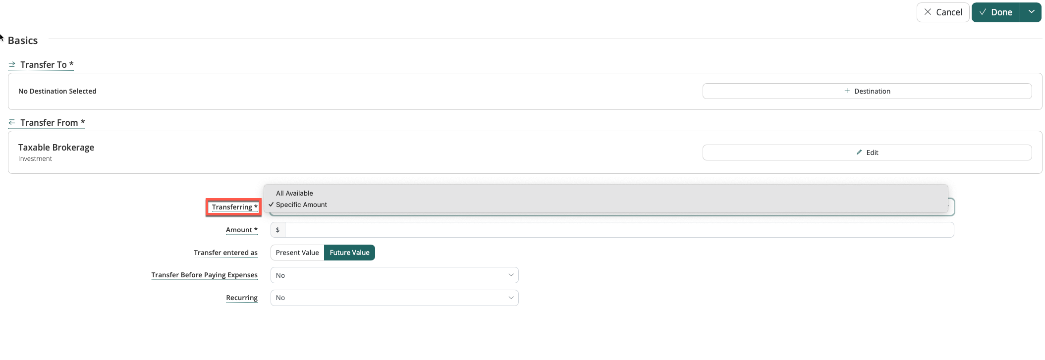 Under Transfer From, select the appropriate asset, and under Transfer To, select the appropriate Investment